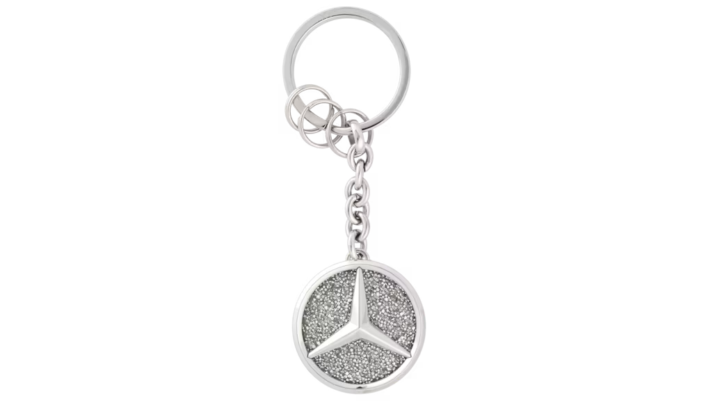 Vivere ogni giorno un po' del fascino della Francia meridionale: con il portachiavi Saint Tropez tutte le tue chiavi trovano il proprio posto. Il ciondolo in acciaio legato ha la forma dell'iconica Stella Mercedes incastonata su un fondo di cristalli di vetro neri/grigi. Mentre il marchio denominativo Mercedes-Benz è inciso nell'anello portachiavi principale, tre ulteriori mini-anelli permettono di agganciare o rimuovere facilmente anche singole chiavi.